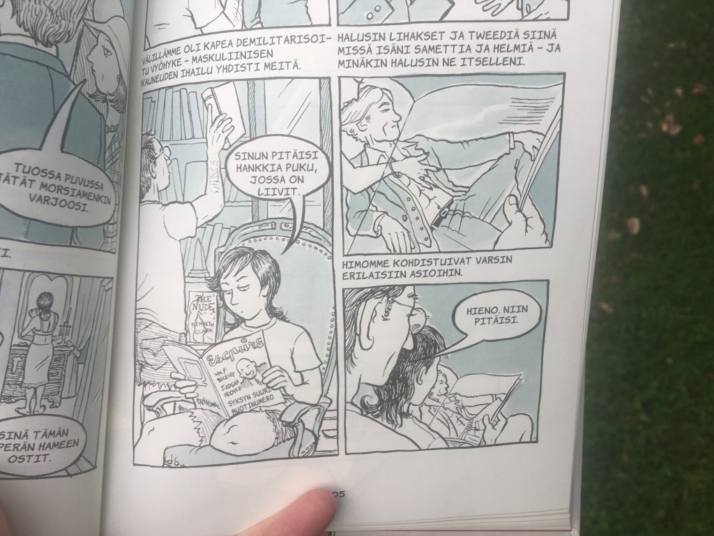 Bechdelin piirrostyylin haamu myös kummitteli takaraivossa, varmaankin sen takia, että joskus Hautuukodin vanavedessä luin häneltä kaiken muunkin kasvukaupunkini kirjastosta. Hatarilla muistikuvilla sukelsin takaisin sarjakuvaan, joka oli vähemmän eksplisiittinen kuin muistin ja huomattavasti enemmän täynnä kirjallisuusreferenssejä.