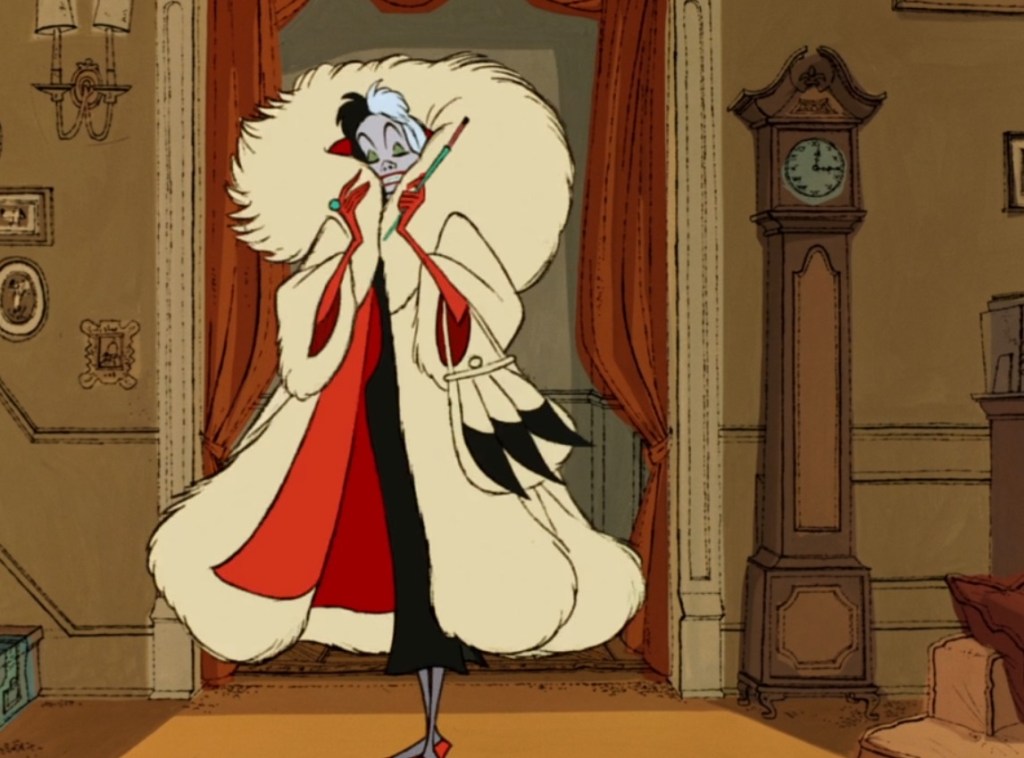 Kun Cruella ensimmäisen kerran esitellään elokuvassa vierailulla Anitan ja Rogerin kotiin, hänen rakkautensa turkiksiin tuodaan esille suoranaisena luonteenpiirteenä. Anitakin toteaa, että turkki voisi olla ihan kiva, mutta elämässä on muutakin. Elokuvassa asetetaan täten vastakkain Cruellan materialistinen ajattelu ja hedonistinen elämäntyyli verrattuna Rogeriin sitoutuneeseen, koirarakkaaseen Anitaan.