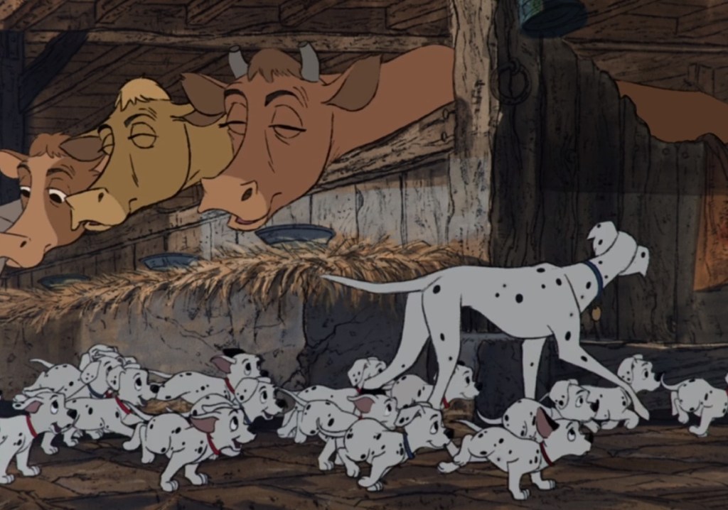 Näistä lehmätkään eivät ole samanarvoisia kuin koirat, vaikka nekin puhuvat ja myös toimivat auttavien sivuhahmojen roolissa. Kun lopulta koirat ovat pelastuneet ainakin hetkellisesti välittömästä vaarasta tulla nyljetyiksi turkiksiksi, seikkailusta kuullut bordercollie tarjoaa heille majapaikkaa navetasta. Ulkona on ollut myräkkä ja 99 pentua ovat kylmettyneitä ja nälissään. Perditasta ei ole ruokkimaan niin monta pentua.